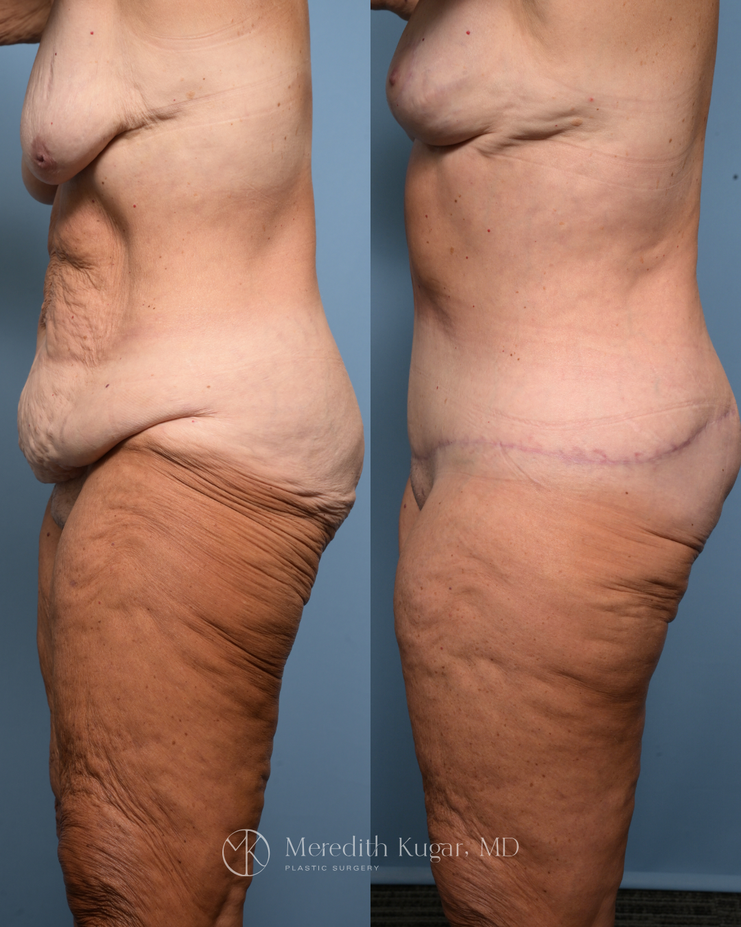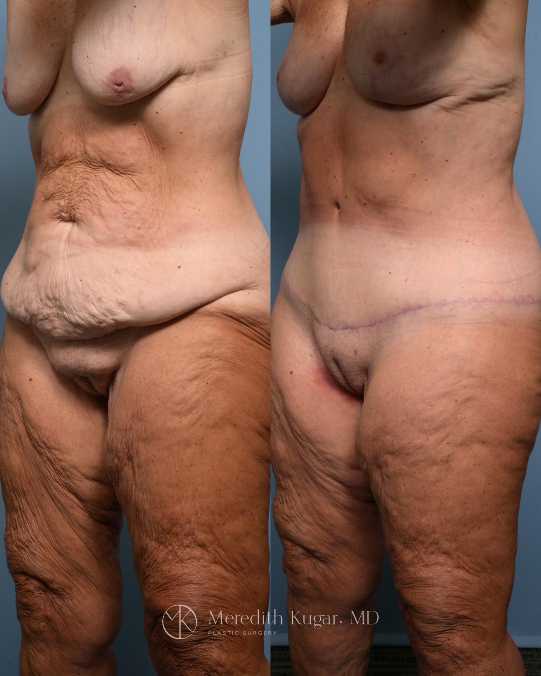 After losing 70 pounds with a GLP-1 medication, this 67 year old patient was ready to feel good in her body again. She did not want implants but wanted to address changes from her weight loss. She underwent a mastopexy (breast lift) and extended abdominoplasty with SAFELiposuction. This combination of breast and body surgery is often called a mommy makeover. The extended tummy tuck approach also created significant improvement to her lateral thighs, as shown in the photos. Results shown here at 5 months post-surgery.
