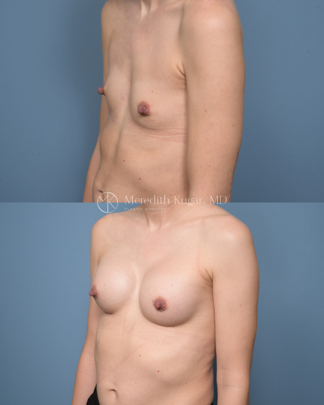 This 34-year-old nurse and mother of 2 is 5'4" and 113 pounds. She underwent breast augmentation with Motiva Ergonomix moderate profile implants placed under the muscle: 265cc bilaterally. Results shown here at 3 months post-surgery.